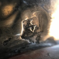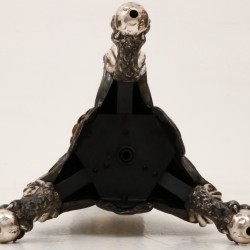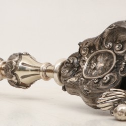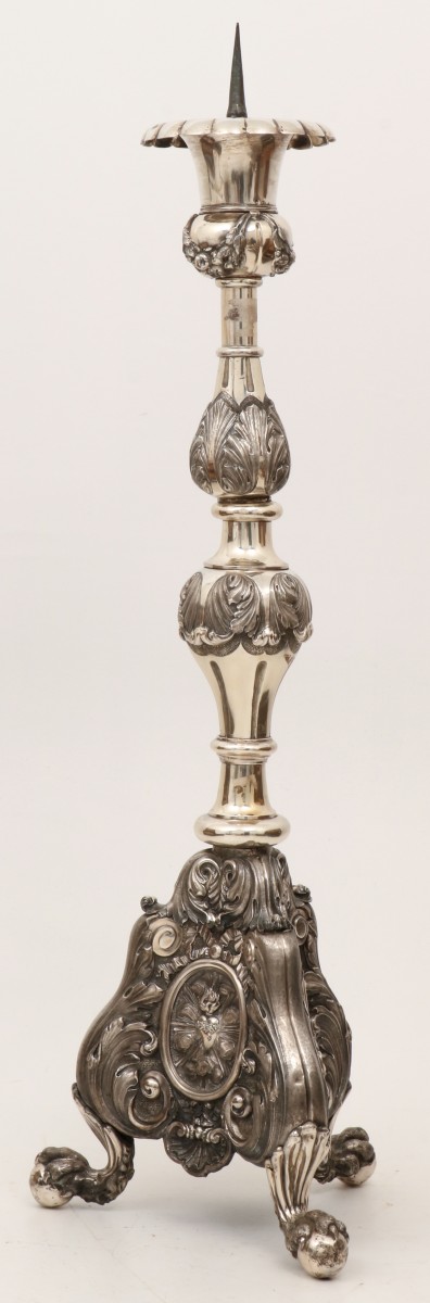 Exceptioneel groot model vol met versieringen op 3 klauwpoten staande op bollen. De kandelaar is opgebouwd op een stalen frame. Nederland, Zwolle, Willem Hendrik Visscher, 1830-1868, keurtekens: V met kroon, minerva, meesterteken, zwaardje - gebruikssporen en deukjes. 5197 gram, 835/1000. Afm. B 38 cm, H 120 cm. Geschatte opbrengst: € 750 - € 2500.