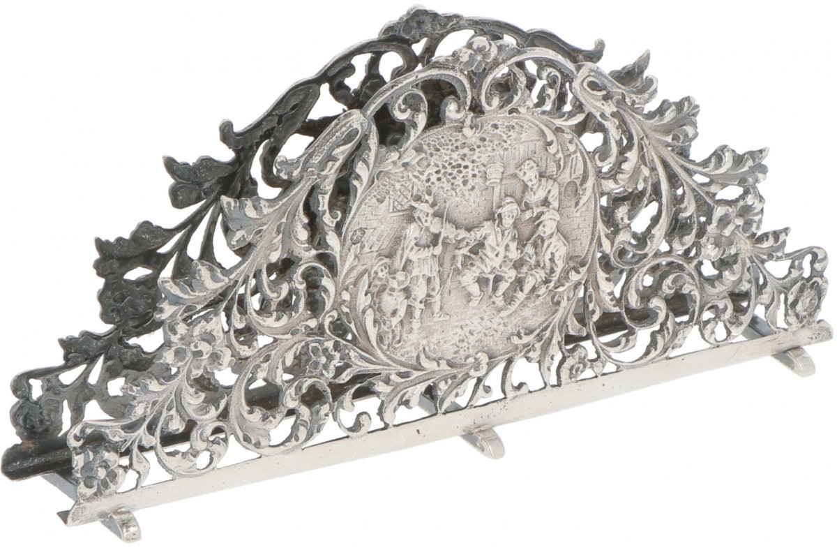 Gegoten model, aan beide zijden deels opengewerkt met rocailles en reliëfscene in cartouche. Nederland, Zutphen, B.W. van Eldik, 20e eeuw, keurtekens: Leeuw, Minerva, meesterteken, - gebruikssporen. 119 gram, 835/1000. Afm. L 14.7 cm, B 3.4 cm, H 7.5 cm. Geschatte opbrengst: € 10 - € 70.