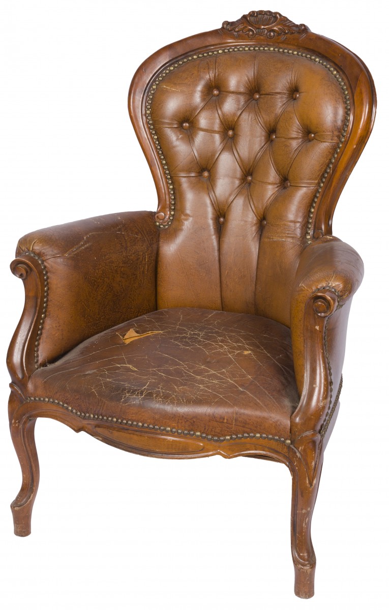 Met gecapitonneerde rugleuning, leren bekleding, diverse beschadigingen. H: 92 cm. Geschatte opbrengst: € 30 - € 50.