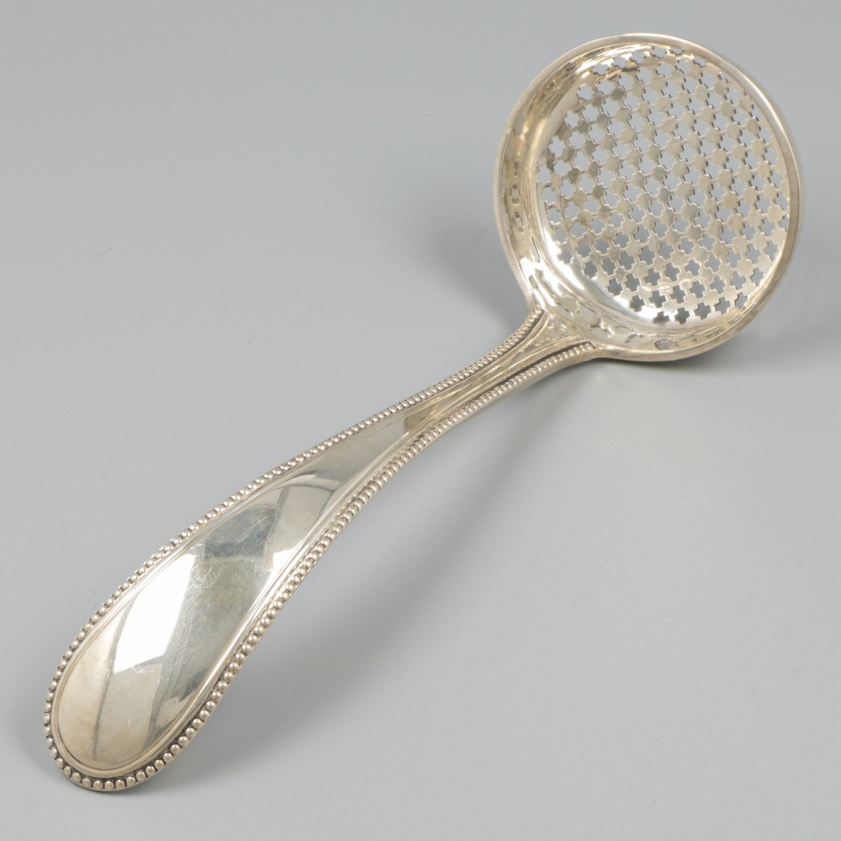 Uitgevoerd in Hollands rondfilet, met parelrandversiering en opengewerkte schepbak. Nederland, Amsterdam, Jan Hendrik Eversbag & Daniël van Outvorst, 1887, keurtekens: staande leeuw, Minerva, meesterteken, C, juwelierskeur: A. Bonebakker & Zoon - lichte gebruikssporen. 61 gram, 925/1000. Afm. L 16 cm.