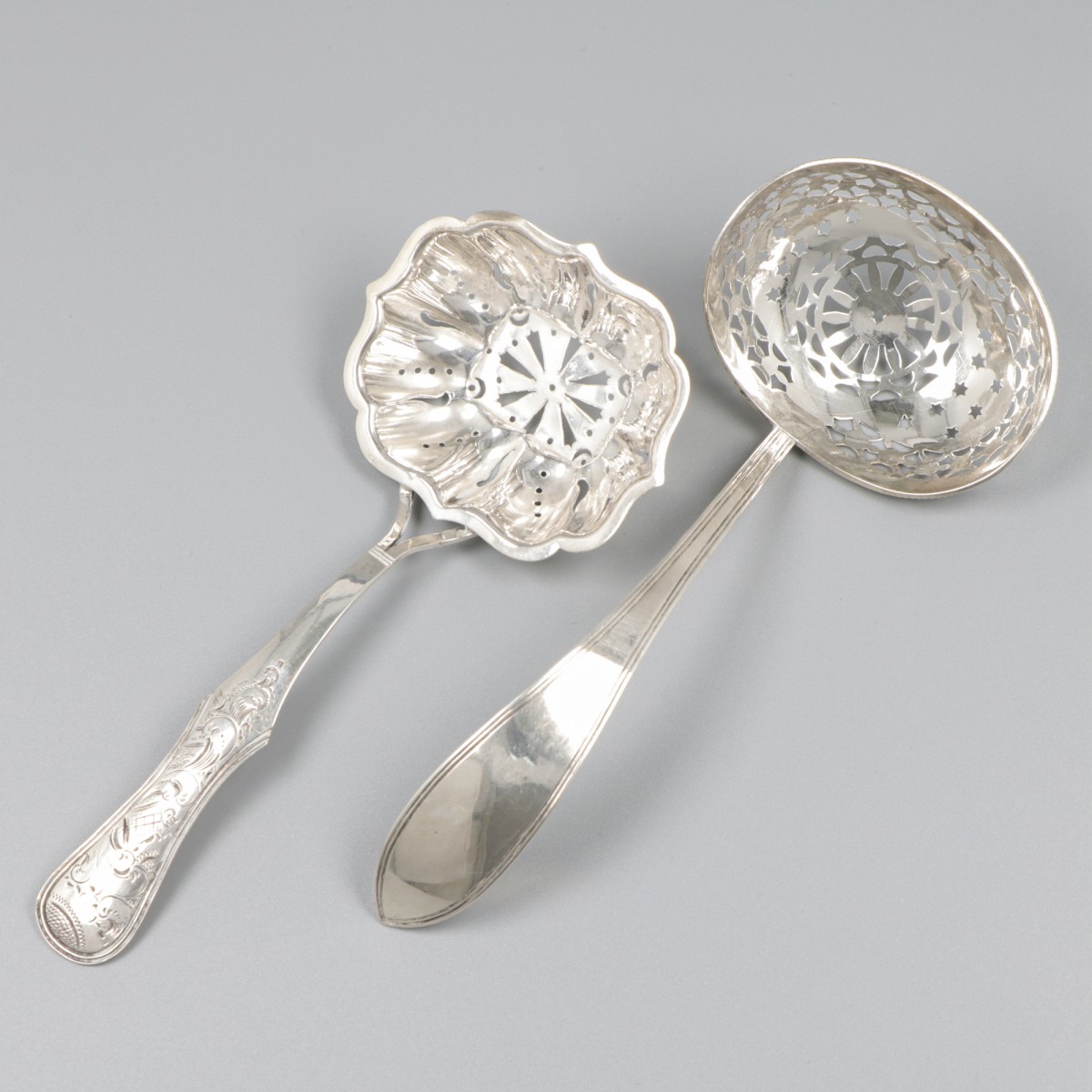 Beide met opengewerkte strooibak, filetranden en gegraveerde decoraties. Nederland, Schoonhoven / Alkmaar, wed. Hendrik v/d Ree (Andrijntje Uittenbogert) / Johannes van Leuven Sr., 1856 / 1828, keurtekens: leeuw, Minerva, meestertekens, W, T. 41 gram, 835/1000.
