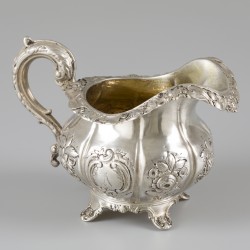 Fraai groot model voorzien van gedreven florale decoraties. Verenigd Koninkrijk, Londen, John Wakelin & William Taylor, 1789, keurtekens: leeuw, panterkop (stadskeur Londen), meesterteken, O, plichtkeur (George III). Inscriptie: A - gebruikssporen en reparatie. 309 gram, 925/1000. Afm. L 15,5 cm, B 10,5 cm, H 11 cm.