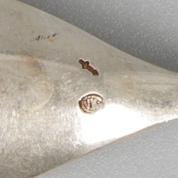 Uitgevoerd met meegegoten florale decoraties. Nederland, Zeist, Gerritsen & van Kempen, 20e eeuw, keurtekens: zwaardje, meesterteken - gebruikssporen. 98 gram, 835/1000. Afm. L 10,5 cm.