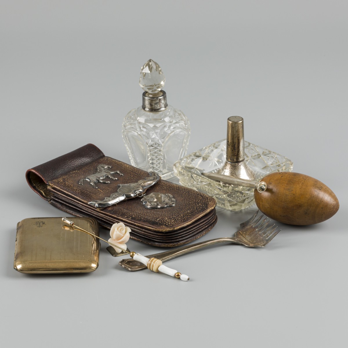 Waaronder een etui, flacon en baconvorkje. 20e eeuw, keurtekens: diverse keuren - gebruikssporen en deukjes. 561 gram, 925/1000, 835/1000 en 800/1000, onedel.