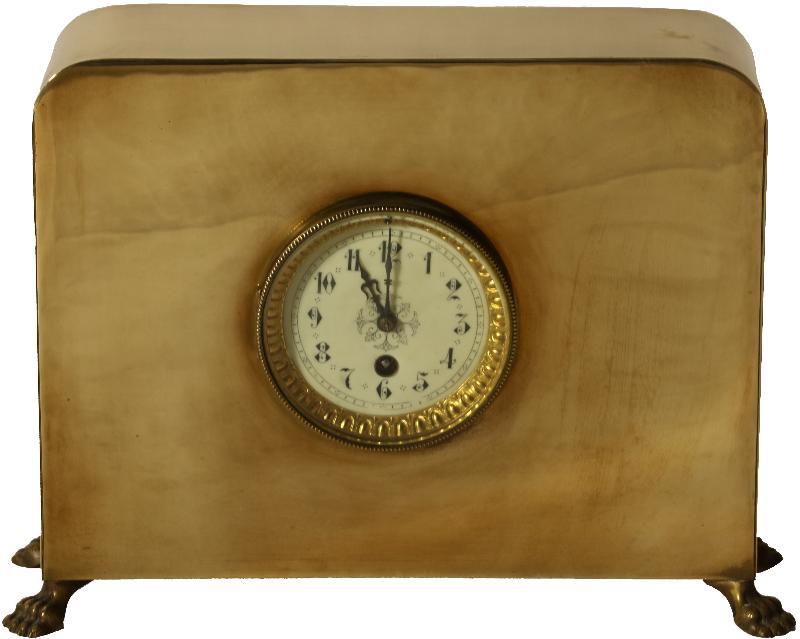 Op klauwpoten met wit geƫmailleerde wijzerplaat. Ongesigneerd Vermoedelijk Frans. In strakke messing behuizing, enkele deukjes. Klok is lopend, onbekend of hij nauwkeurig loopt. geen sleutel aanwezig. Ca. 1900. afmetingen 28 x 37 x 12 cm.