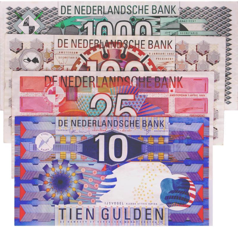 Nederland. 10/25/100/1000. Bankbiljet. Type 1989-1997. IJsvogel/Roodborstje/Steenuil/Kievit - Zeer Fraai +.