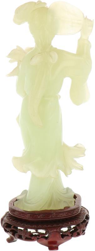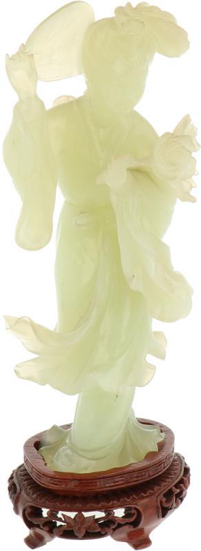 #4822 | Een in jade vervaardigd figuur in de vorm van een Chinese vrouw met waaier en bloem, incl. sokkel. China, 19e/20e eeuw.