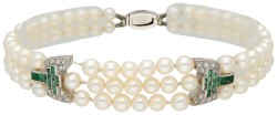 #2648 | 14 kt. Witgouden art deco parel armband en tussenstukken bezet met smaragd en diamant.