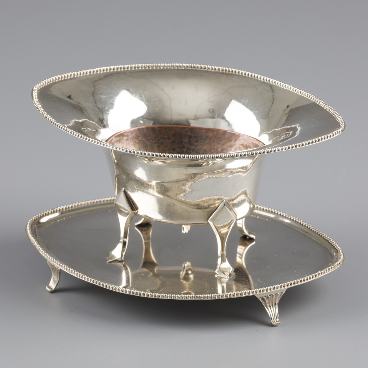 Een zilveren pijpkomfoor in Empire-stijl, met koperen binnenbak, staande op een basement met vier (op)gesoldeerde poten. Nederland, Amsterdam, Hendrik Smits, 1802, keurtekens: staande gekroonde leeuw, stadskeur, meesterteken (HS:), jaarletter T, juwelierskeur Diemont, tweemaal essayeurssteek, J-herkeur - gebruikssporen. 444 gram, 934/1000. Afm. L 18 cm, B 12,8 cm, H 10,2 cm.