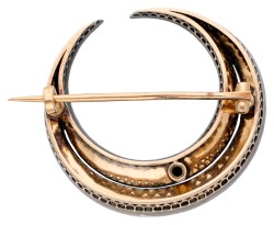 Bezet met 43 roos geslepen diamanten mogelijk gezet op folie. In goede conditie. Keurtekens: Nederlands waarborgkeur 585. L x B : 36 x 34 mm. Gewicht: 12.05 gram.