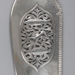 Prachtig Victoriaans model met deels ajour schep waarin twee vissen zijn verwerkt. De steel is bevestigd aan de bak in de vorm van een dolfijn. Tevens is de steel voorzien van twee hoornen des overvloeds en een ster in cartouche. Verenigd Koninkrijk, Londen, William Knight II, 1839, keurtekens: leeuw, panterkop, meesterteken (WK), jaarletter D, Queen Victoria plichtskeur. 210 gram, 925/1000. Afm. L 30,8 cm, B 6,7 cm.