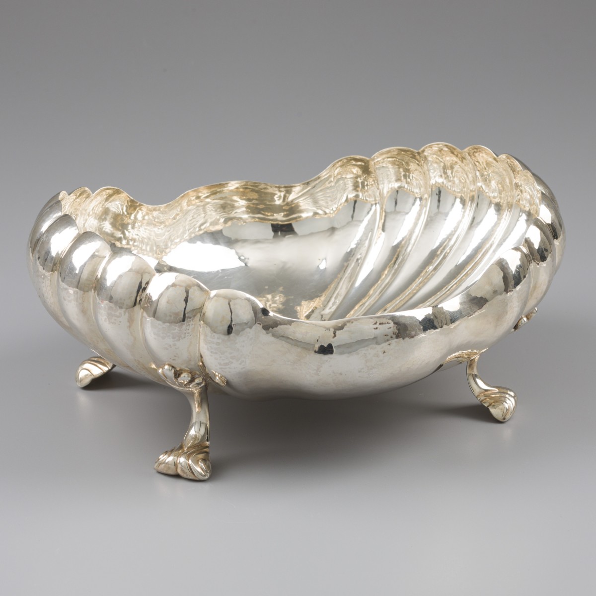 Zeer fraaie Art Deco fruitschaal / tafelstuk met gelobde schelvormige zijde. Voorzien van gehamerde details en staand op vier gestileerde poten. Italië, Padua, circa 1935, keurtekens: stadskeur / onbekend meesterteken (17 PD), 800. 816 gram, 800/1000. Afm. L 28 cm, B 22 cm, H 11,5 cm.