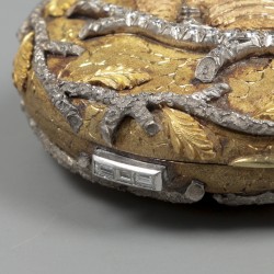 Prachtig exemplaar compact / poederdoos in 18 kt. Tri-color goud uitgevoerd. Het scharnieren deksel is gedecoreerd met paddenstoelen decoraties met roségouden steel, witgouden tussenstuk met in elk 3 single geslepen diamanten en een geelgouden hoed. Daaromheen zijn witgouden takken met geelgouden bladeren aangebracht. De middelste tak bevat 17 single geslepen diamanten. De bovenzijde bevat dus in totaal 26 single geslepen diamanten van totaal ca. 0.13 ct. (SI/P - G/H). De onderzijde bevat eveneens een decor van paddenstoelen en takken. De ondergrond waar het decor op is aangebracht, is uitgevoerd in slangenmotief. Het doosje opent middels een kliksluiting waarvan de knop bezet is met drie baguette geslepen diamanten van ca. 2.36 x 1.63 mm per stuk (VS/SI – G/H). De binnenzijde bevat een spiegeltje aan de ene kant en aan de andere kant is er ruimte voor het poedergedeelte. Italië, Rome, Paolo Cazzaniga, circa 1950, keurtekens: 750, Roma, Cazzaniga. 89 gram, 18 kt. Afm. L 4,9 cm, B 4,8 cm, H 1,9 cm.