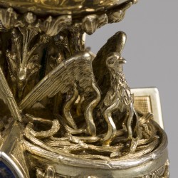 Een zeer prachtige zilveren miskelk met pateen, volledig uitgevoerd met gouden vergulding. Voorzien van een bijzondere inscriptie waar de namen Alphonse Bellesheim (Duitse kerkhistoricus en provoost van de Dom van Aken) en Paus Leonis XIII (256e paus van de Rooms-Katholieke Kerk) op staan. De miskelk is uitgevoerd met een rijk gedecoreerde stam met drie diverse vogels waarvan twee met jongen omringt. Tevens bevat de stam drie schildvormige knoppen met emaillen wapenschilden. Daaronder zijn raamvormige elementen verwerkt met emaillen inleg. De voet is voorzien van een opengewerkte rand en een gegraveerd element die ook terug is te zien op de pateen. De inscriptie ziet u op de foto’s op onze website. Zeer uniek exemplaar! Duitsland, Aken, August Witte, 1899, keurtekens: maan, kroon, 800, meesterteken (A. Witte), Aachen, 1899, wapen van Vaticaanstad. 879 gram, 800/1000. Afmetingen miskelk (lengte x breedte x hoogte): 14,5 x 14,5 x 18 cm. Afmetingen pateen (diameter): 14.7 cm.