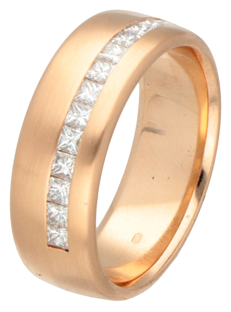 Bezet met 13 princess geslepen diamanten van totaal ca. 0.40 ct. (VVS2-VS1 / F-G). Keurtekens: 750 Nederlands waarborgkeur. In goede conditie. Ringmaat: 17.75 mm / 56 mm. Breedte ring: 0.7 cm. Gewicht: 10.20 gram.