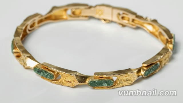 Bezet met acht zoisiet stenen. In goede conditie. Keurtekens: Internationaal conventiekeur 585, Fins waarborgkeur 585, jaarletter: Y7 1976. Meesterteken: Björn Weckström. Lengte: ca. 18 cm. Gewicht: 21.03 gram