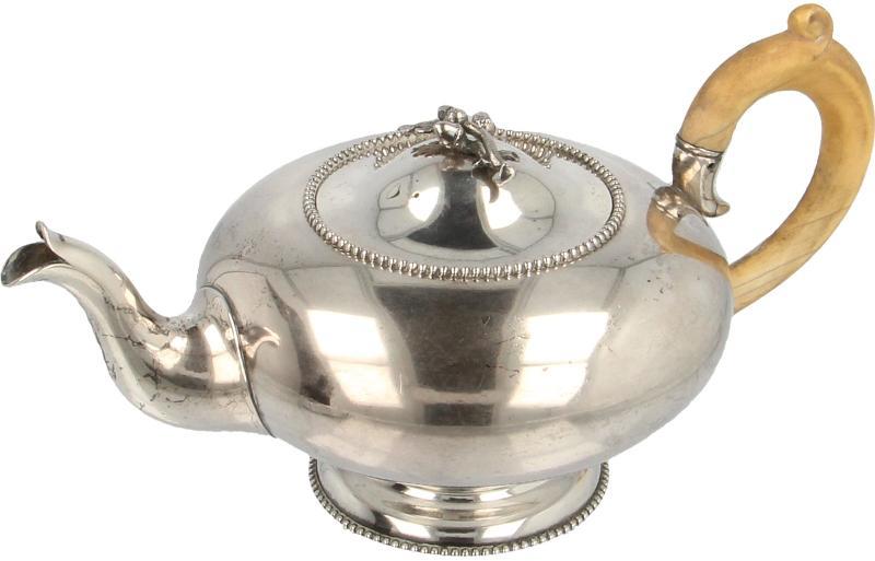 Met parelrand en op de deksel een versiering van eikels en eikenblad, met benen heft. Mooi gekeurd met Jaarletter O = 1873, A Bonebakker & zoon, AB&Z, lopende leeuw en R"bloem"1. afmeting 10x21,5x12 cm gewicht 367,8 gram