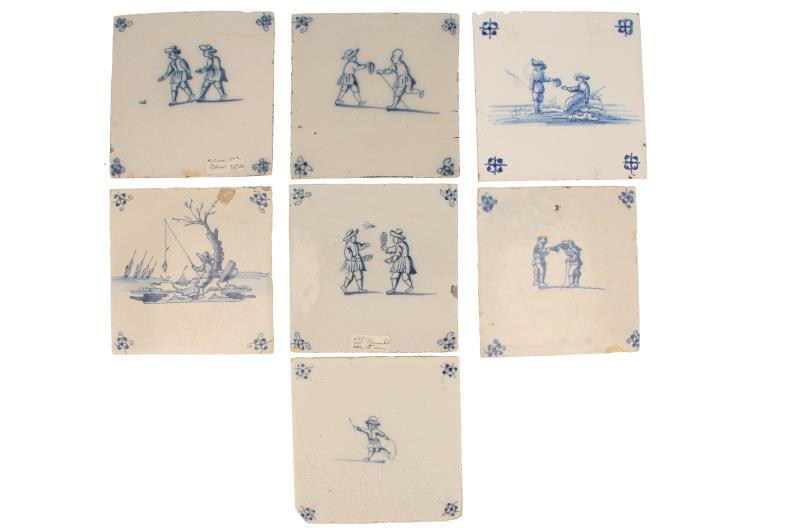 Met afbeeldingen van onder andere spellen. 2 Tegels begin 20e eeuw, de rest 18e eeuw. Diversen met randschade.