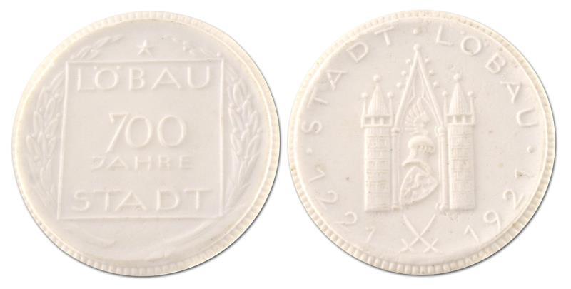 Vz. Stadswapen. Kz. 4-regelige tekst binnen vierkant. Wit porselein 38,6 mm. Prachtig.