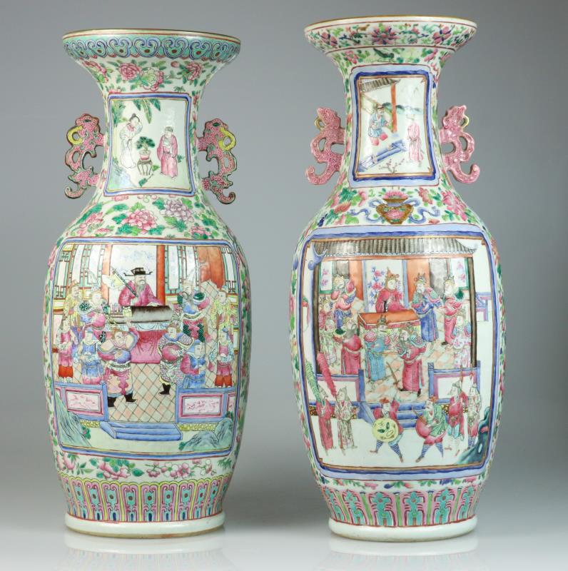 #3964 | Een set van (2) porseleinen balustervazen met decor van Chinese figuren. China, 1e helft 20e eeuw.