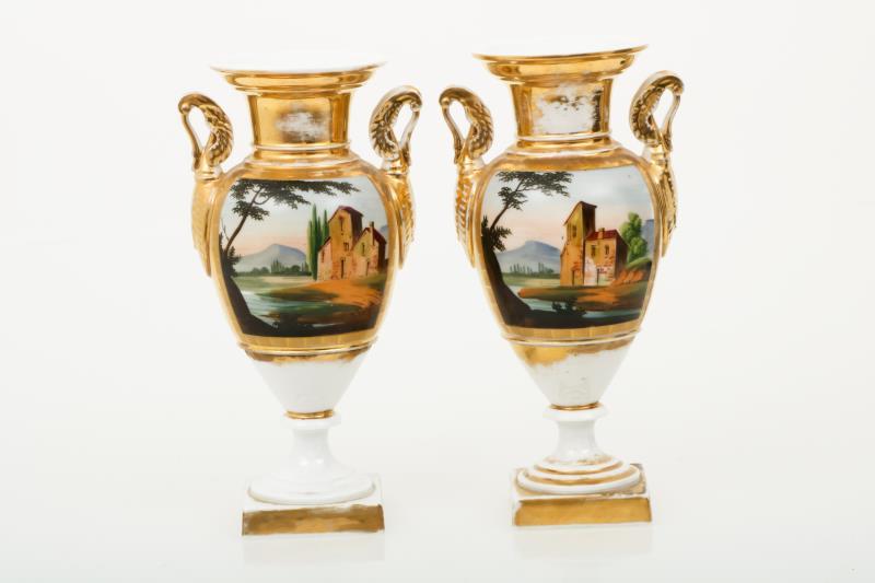 #4151 | Een set van (2) porseleinen schouwvazen beschilderd met verschillende scénes. Frankrijk, eind 19e eeuw.