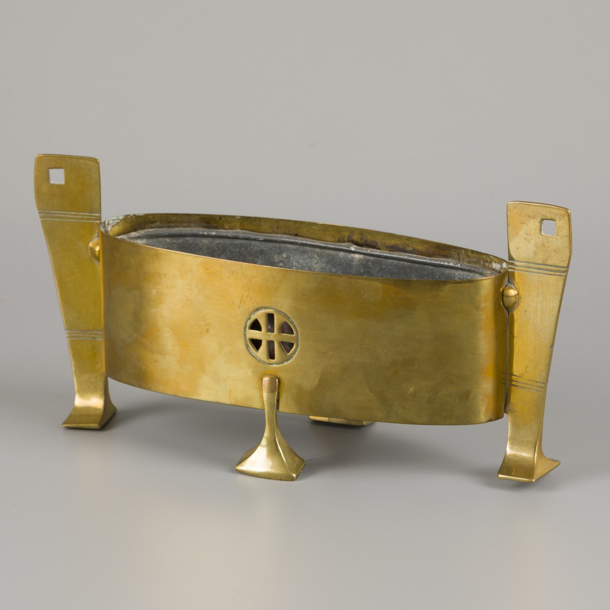 Ovaal en met twee gestileerde grepen, ajour medaillon aan beide zijdes en rustend op vier poten, inclusief zinken binnenbak. Afm. L: 8 cm, B: 23,5 cm, H: 11,1 cm. Geschatte opbrengst: € 80 - € 120.