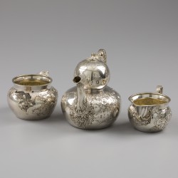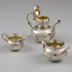 Fraai driedelig servies bestaande uit een koffie- / theepot, melkkan en suikerpot voorzien van rijke florale decoratie en rocailles. Rusland, Moskou, Carl Fabergé, 1891/1892, keurtekens: meesterteken, 1891/1892, 84, essayeursteken, stadskeur Moskou. 652 gram, 84 Zolotniki 875/1000. Afm. H 12 cm.
