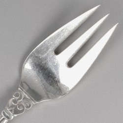 #686 | Georg Jensen visvorken (6), model Acorn, zilver. Ontworpen door Johan Rohde in 1915.
