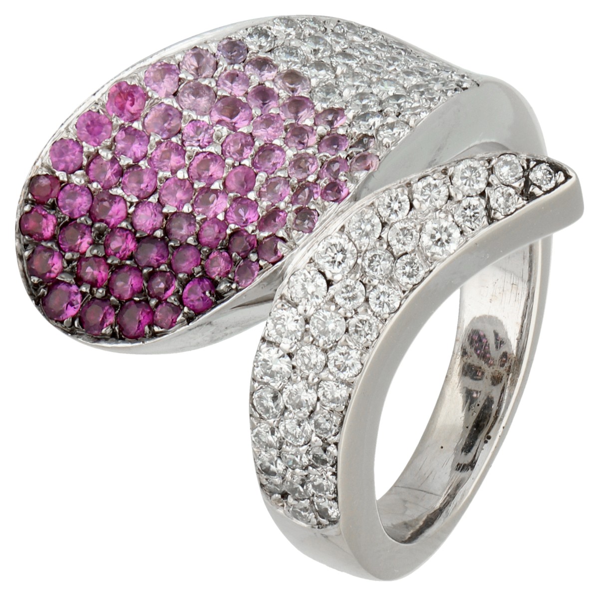 Bezet met 50 briljant geslepen diamanten van totaal ca. 0.50 ct (VS - SI / F - G) en 64 roze en donkerroze saffieren van diverse afmetingen. In goede conditie. Keurtekens: Nederlands waarborgkeur 585. Ringmaat: 17.75 mm / 56 mm. Gewicht: 14.57 gram.