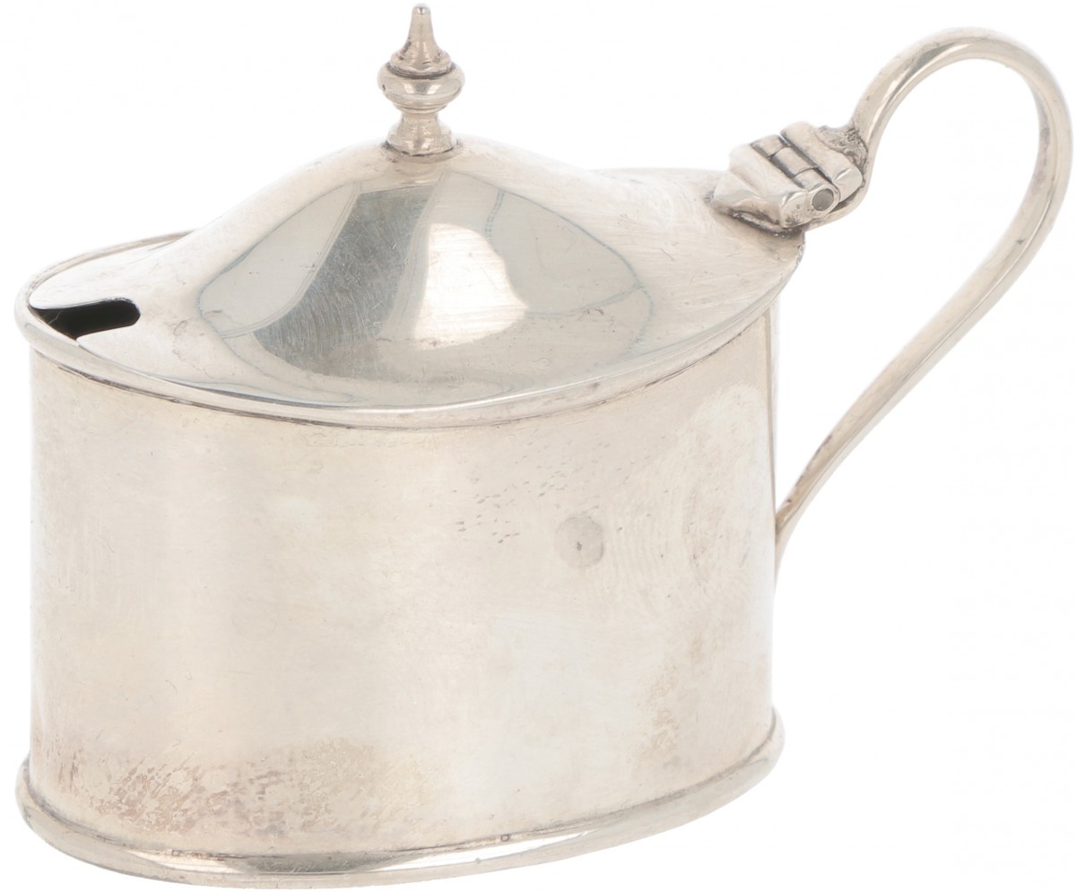 Ovaal model voorzien van blauw glazen inzetbak en opgesoldeerd handvat. Verenigd Koninkrijk, Birmingham, begin 20e eeuw, keurtekens: Leeuw, anker, onduidelijk meesterteken en jaarletter, - gebruikssporen en slijtage. 81 gram, 925/1000. Afm. L 8 cm, B 3.6 cm, H 6 cm. Geschatte opbrengst: € 25 - € 75.